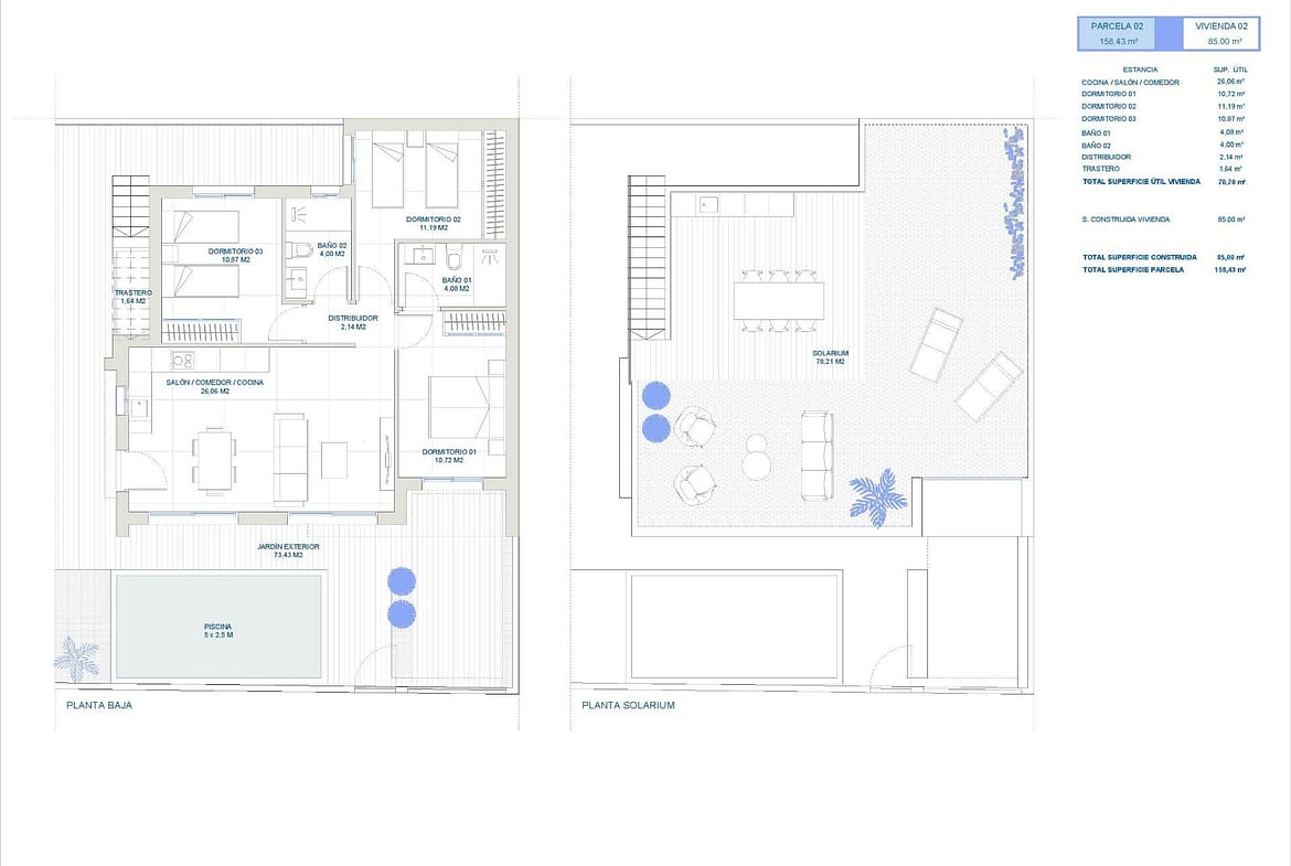 NEW BUILD SEMI-DETACHED VILLAS IN ROLDAN New Build semi-detached villas in Roldan, Torre Pacheco. Modern villas build over one floor, has 2 or 3 bedrooms, 2 bathrooms, open plan kitchen with the lounge area, fitted wardrobes, private solarium. All villas has private garden with pool and parking space. Roldan itself is a traditional town with all the local amenities you will need including Supermarkets, Restaurants, Bars, Health Clinic, Pharmacy, Police Station, Petrol Station, Mechanics, Dentists, Doctors and more. The nearby golf resorts of La Torre, & Terrazas are easily accessible, Corvera Airport is 15 minutes away & the beaches of the Mar Menor just 20 minutes drive.