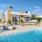 Beach-style swimming pool with sun loungers and parasols.