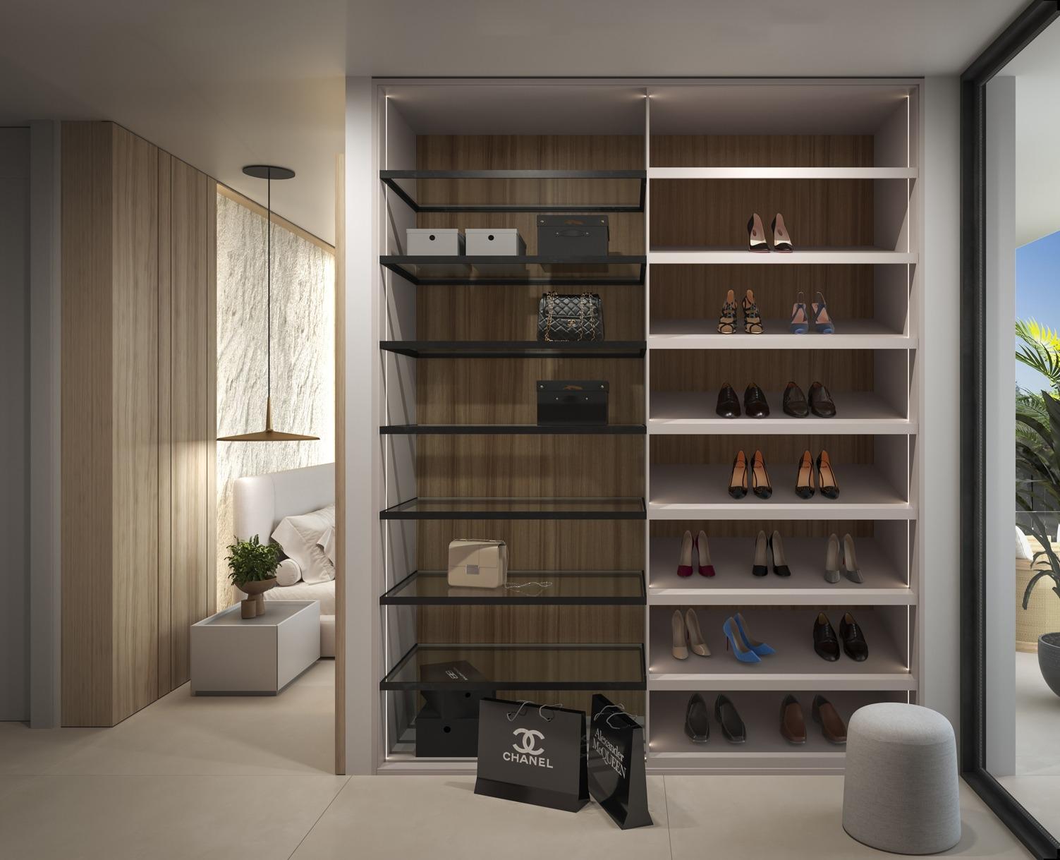– In master bedroom, dressing room with LED lighting and functional distribution with drawer units and glass shelves.