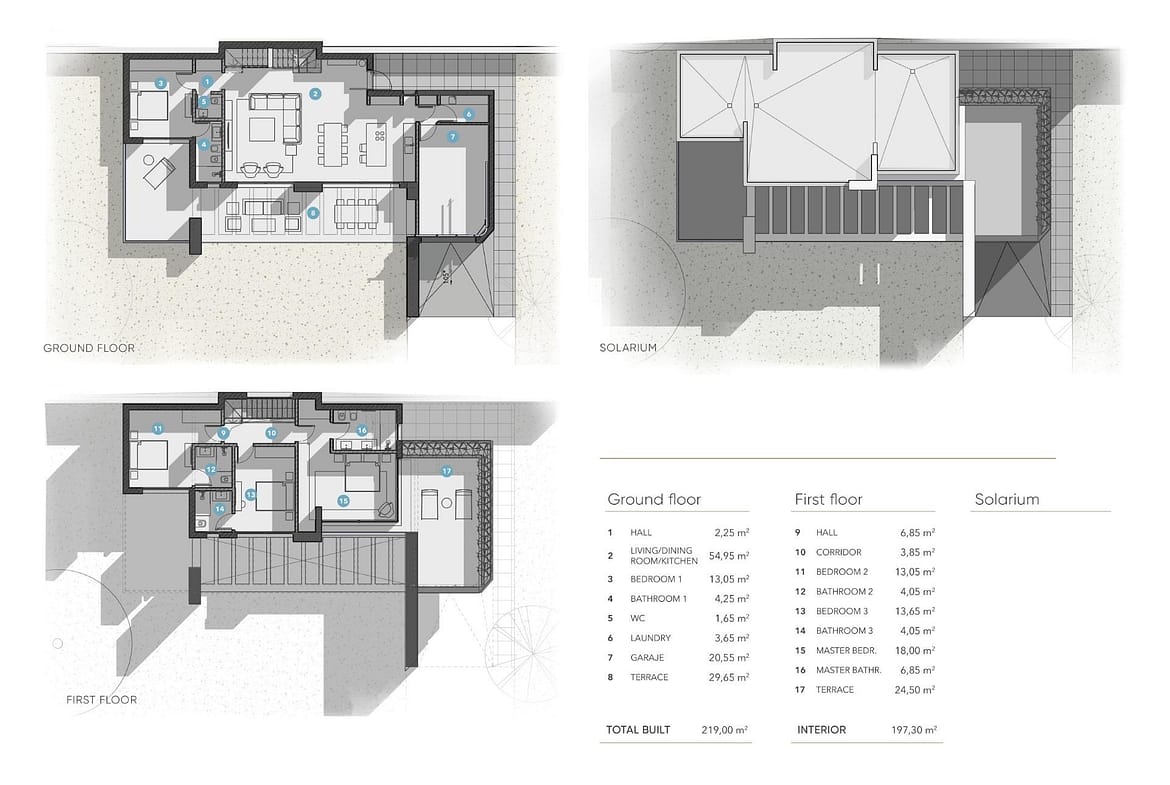 Luxury villas have a well-distributed interior space where a living area, dining area and fully fitted kitchen with breakfast area blend into a living space that maximizes views from oversized triple aspect doors and windows. Connection between outside and inside space is seamless with generous covered and uncovered terraces – the perfect place to relax and enjoy the views overlooking to the Mediterranean Sea.