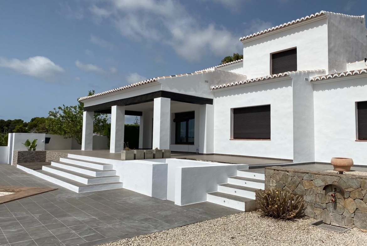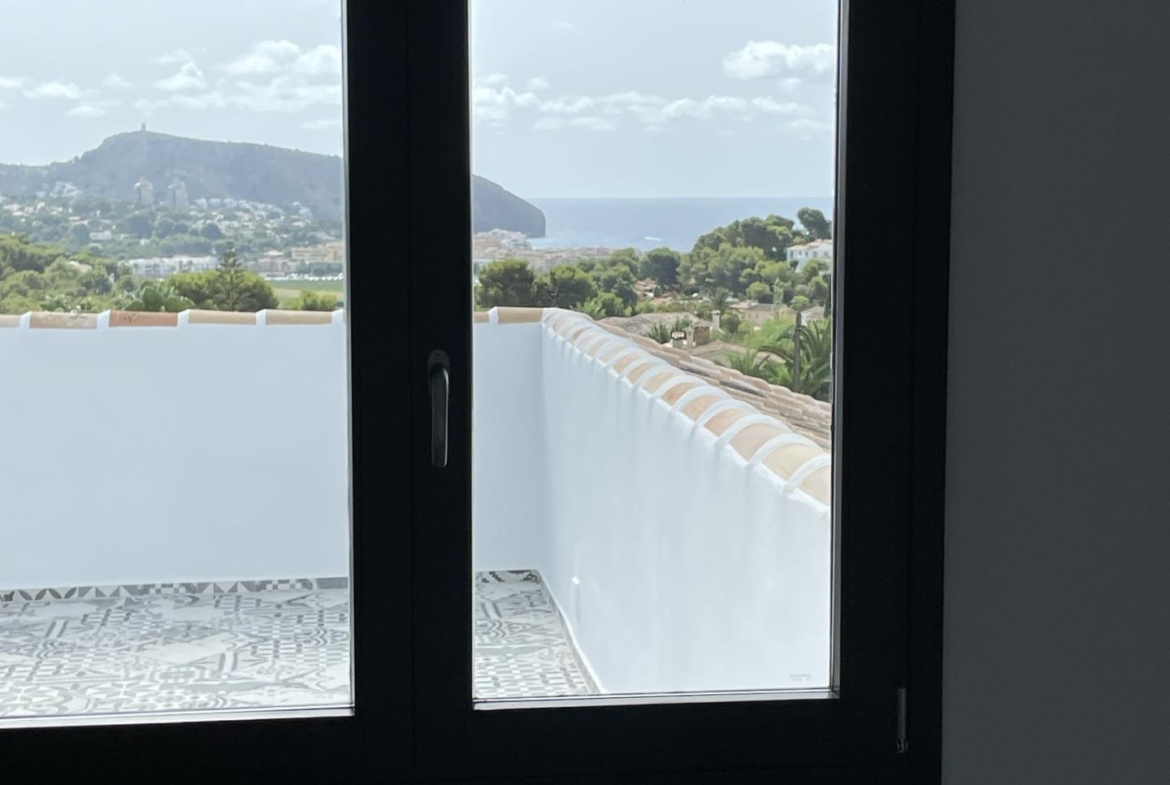Mediterranean Style Villa with Sea Views for Sale in Moraira, Costa Blanca Elegant Villa with Panoramic Sea Views This beautiful Mediterranean-style villa for sale in Moraira (Costa Blanca, Alicante) offers breathtaking open views of Cape Moraira, the sea and the surrounding coastline. Set on a hilltop, the property enjoys total privacy and tranquility while remaining just 2 km from the vibrant center of Moraira, its golden beaches, supermarkets, restaurants and cafés. Built on a nearly flat plot of 897 m2, the villa provides exceptional comfort, beautiful outdoor spaces and stunning views from all main rooms. Spacious Layout Over Two Floors The villa is distributed over two levels designed to maximize natural light and sea views. On the ground floor, there is a bright living-dining room with a fireplace, a space ready for the installation of a modern kitchen and laundry area (pre-installed plumbing and electricity), and a complete bathroom with a shower. This floor also features a connected yet independent guest apartment with its own entrance, consisting of a living-dining area that could serve as a master suite, a bedroom, a bathroom and an additional space pre-fitted for a dressing room or en-suite bath. The apartment’s entrance showcases a beautifully restored solid wood door, adding authentic Mediterranean charm. On the upper floor, accessed by internal stairs, you will find two comfortable bedrooms, a bathroom and a large solarium terrace with spectacular sea views—perfect for relaxing or enjoying the sunset. Outdoor Living and Mediterranean Charm The villa’s exterior is designed for enjoying the Mediterranean lifestyle to the fullest, featuring spacious terraces, a uniquely shaped private pool with an outdoor shower and an easy-to-maintain garden with automatic irrigation. There is ample space for outdoor dining, sunbathing and entertaining family and friends. High Quality Features and Finishes This property offers modern comfort combined with Mediterranean character, including Aluminum carpentry with wood effect finish and double glazing Motorized blinds and mosquito nets in bedrooms Built-in wardrobes with sliding doors Central heating by radiators Adjustable interior lighting Motorized sliding vehicle gate and pedestrian access Private parking within the plot Prime Location Near Key Amenities Moraira town center and beaches: 2 km La Sella Golf Course: 15 km Port of Moraira: 2 km Shopping centers: 5 km Alicante International Airport: 90 km Experience Mediterranean Living at Its Best This exceptional villa combines privacy, elegance and stunning sea views in one of Costa Blanca’s most desirable locations. Contact us today to arrange a viewing or to request more information about this beautiful home in Moraira.