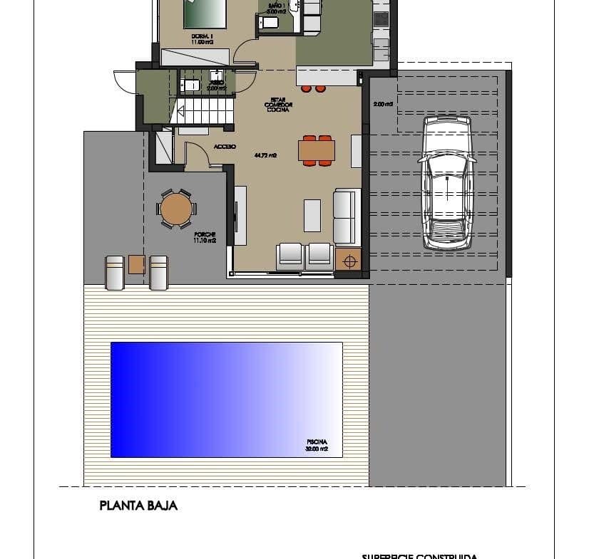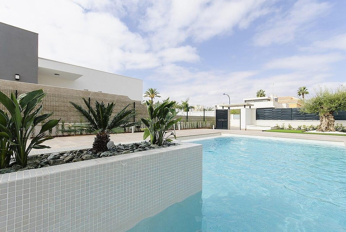 NEW BUILT VILLA IN ORIHUELA COSTA (CAMPOAMOR) Do you want to enjoy an exclusive vacation near the sea? Impossible not to fall for this ultra-modern villa in Orihuela Costa with 4 bedrooms, 2 bathrooms, private pool, garden and luxury extras, according to personal preferences. Its delicate infrastructure integrates with nature providing a quiet and isolated environment. Built with the highest quality materials, this elegant property is surrounded by abundant vegetation and a few meters from the cleanest beaches in Campoamor: Playa de la Glea, Aguamarina and Cabo Roig. It is a pleasure to have these three beautiful beaches that have been awarded with the Blue Flag within reach. Whenever you need a moment of reflection, you can go down to touch its crystal clear waters or lie down on its soft sand to read a book while listening to the placid sound of the sea. In the surroundings you will find all the essential services to live all year round: supermarkets, pharmacies, cafes, restaurants, shopping centers … And if you are also enthusiastic about golf, less than 10 minutes away you can choose between three privileged golf courses of international recognition where put your aim to the test: Las Colinas Golf, Villamartín or Las Ramblas. The promotion includes several models of homes with 2,3,4 and up to 5 bedrooms. This particular villa consists of 4 double bedrooms, 2 bathrooms, a fully equipped American kitchen, an open living-dining room with great lighting, access to the garden and the beautiful pool. In addition, the price includes: Underfloor heating and mirror in bathrooms Indoor and outdoor lights Built-in wardrobes Security door Pre-installation of air conditioning Top brand appliances The house follows the trend of open concept design, enhancing spacious spaces and offering a greater sense of comfort and well-being in its interiors.