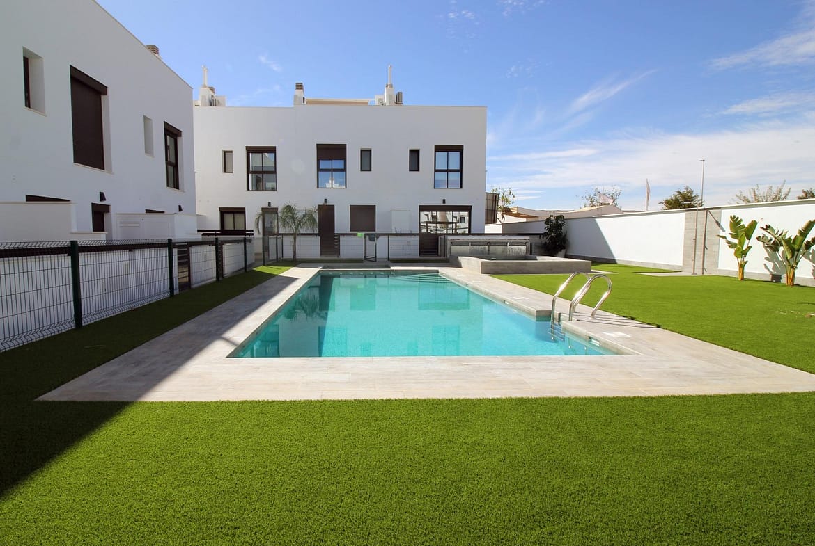 NEW BUILD SEMI-DETACHED TOWNHOUSE IN PILAR DE LA HORADADA New Build modern townhouses built in a quiet part of Pilar de la Horadada with proximity to everything you need. Townhouses has 3 bedrooms, 2 bathrooms, open plan kitchen, living room with direct access to the cozy pool area, terrace at the back with parking space , terrace and large roof solarium. Pilar de la Horadada is a typical Spanish village in the most southern part of the Costa Blanca. The large main street has supermarkets, lots of shops, restaurants and bars and some lovely squares. The beautiful beaches of Torre de la Horadada and Mil Palmeras with fine sand promenade is just 5 minutes away. The airports of Corvera (Murcia) and Alicante are respectively 40 and 55 minutes away.