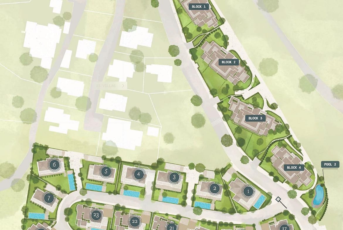 This exceptional project features 23 independent villas and 41 apartments, each thoughtfully designed to blend seamlessly with the stunning natural landscape. Choose from: