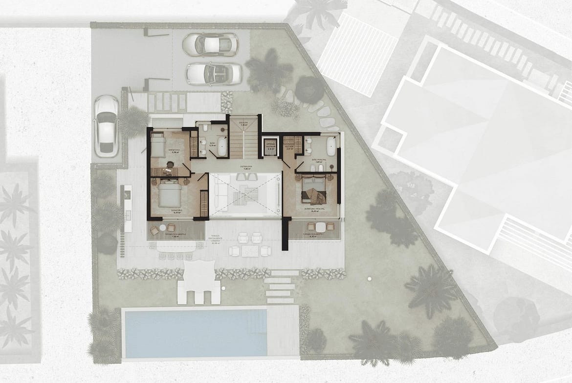 Villas: Spacious layouts with 4, 5, or 6 bedrooms, private pools, lush gardens, and options for one or two floors above ground level. Each villa includes an underground space for added functionality.