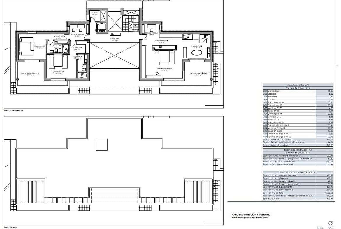 Top quality PORCELAIN STONEWARE floors, dimensions 120x120cm, imitation marble. Bedrooms, main bathroom and upper distributors will be of first quality LAMINATED WOOD, white oak color.